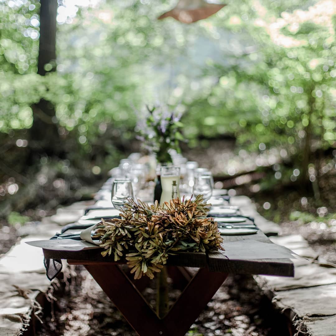 Scenografia stołów została zaprojektowana z naturalnych materiałów, w stonowanej kolorystyce, nawiązującej do otaczającej flory. Każdy element – od serwetek po oświetlenie – został dobrany z myślą o spójności z leśnym klimatem.