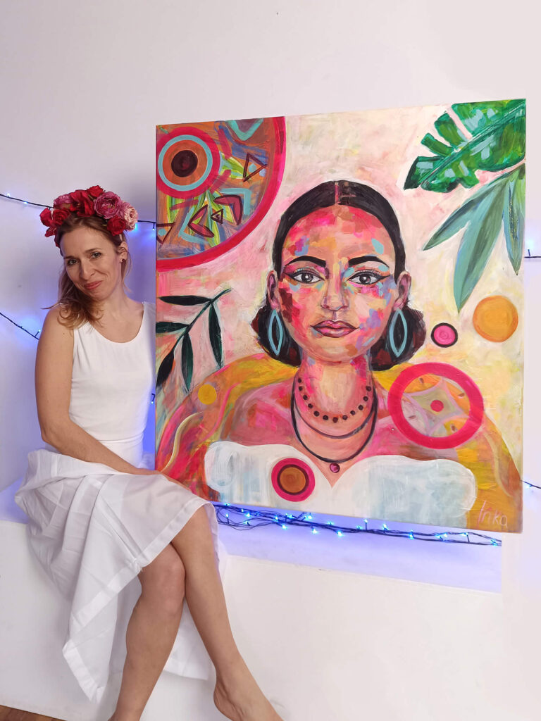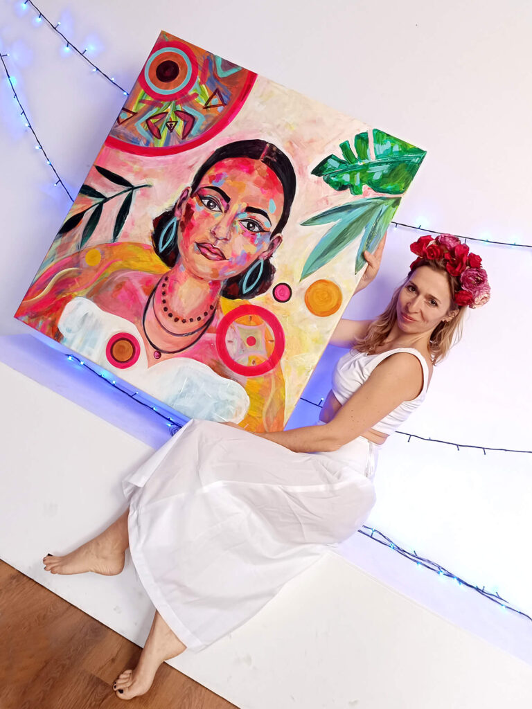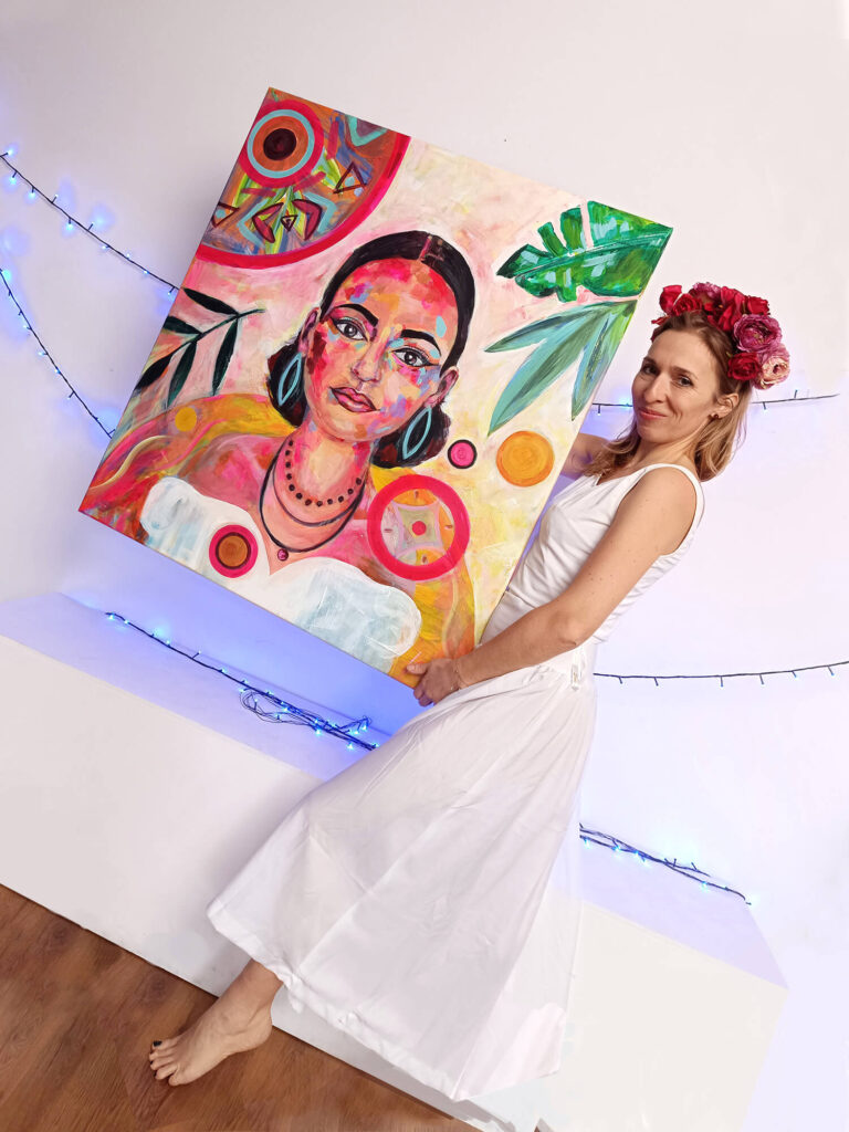 Portret Kubanki, inspirowany stylistyką malarstwa Fridy Kahlo oraz afrykańskimi motywami graficznymi i roślinnością, ukazuje kobietę silną i pełną życia. Czerpie ona z życia garściami, jest pełna energii i pasji, jak żywa dusza, której obecność wypełnia przestrzeń. W tle niemal słyszymy rytmiczną muzykę, która towarzyszy jej w każdym kroku.